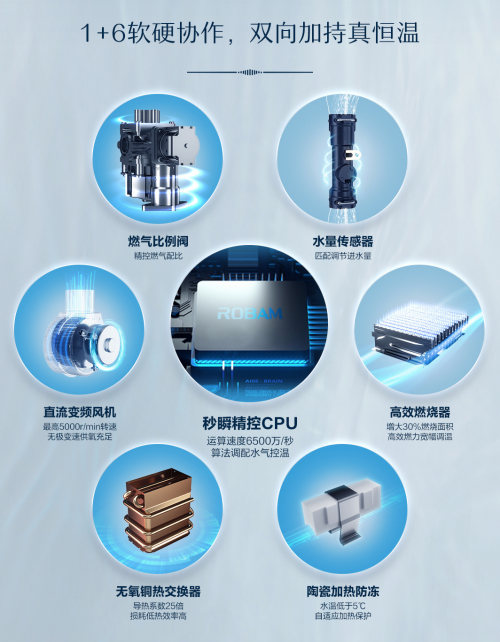 硬件上,【川】系列燃?xì)鉄崴鱄T730搭載秒瞬精控CPU,內(nèi)置全新升級(jí)的PID智能算法,可達(dá)6500萬(wàn)/秒超速運(yùn)算,精準(zhǔn)計(jì)算水氣配比,使燃?xì)獗壤y和水量傳感器快速響應(yīng),迅捷精控持久恒溫。水流量傳感器,可精準(zhǔn)調(diào)節(jié)進(jìn)出口水量,在CPU的配合下實(shí)現(xiàn)水溫恒定;燃?xì)獗壤y,實(shí)時(shí)精控燃?xì)庥昧?#xff0c;高能效穩(wěn)定控溫;高效燃燒器,創(chuàng)新增氧V型火排,增大30%燃燒面積,增強(qiáng)89.68%燃燒效率,削弱15%運(yùn)行噪音,分段穩(wěn)然技術(shù)讓小火中火大火靈活調(diào)控,實(shí)現(xiàn)35-60℃寬幅調(diào)溫。直流變頻風(fēng)機(jī),最高5000r/min轉(zhuǎn)速無(wú)極變速高效供氧充足。高效無(wú)氧銅熱交換器,除了導(dǎo)熱性耐腐蝕性出色,還具備更強(qiáng)的熱沖擊性能。陶瓷加熱防凍,當(dāng)水溫低至5℃,四個(gè)陶瓷加熱器便會(huì)啟動(dòng)加熱保護(hù),無(wú)懼國(guó)內(nèi)高寒天氣,-20℃也能安心熱浴。1+6的軟硬件協(xié)作,便可讓【川】系列燃?xì)鉄崴鱄T730輸出澎湃熱水,給予你舒適的沐浴體驗(yàn)與不間斷的溫暖關(guān)懷。