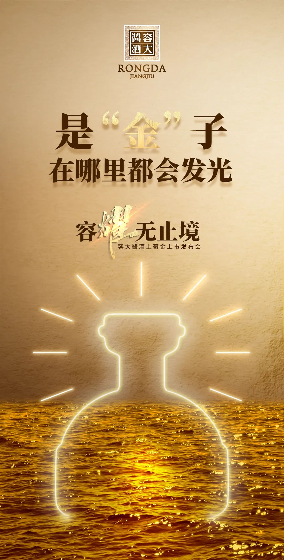 這是容大醬酒的手筆。4月下旬,容大醬酒戰(zhàn)略新品即將上市。樸實(shí)的宣傳語,透露出其口糧醬酒的市場(chǎng)定位;奢華的土豪金顏色,又給人無限遐想,讓人對(duì)其品質(zhì)有了更多期待。
