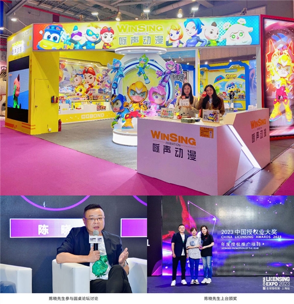? 6月28日至30日,詠聲動漫攜旗下豬豬俠、百變校巴、詠玩潮·羊圓圓等IP空降2023全球授權(quán)展·上海站(LEC),兩大全新IP《喵能戰(zhàn)士》《反斗聯(lián)萌》首次亮相,吸引眾多企業(yè)現(xiàn)場咨詢。展會期間,詠聲動漫副總裁、國際授權(quán)業(yè)協(xié)會大中華區(qū)顧問委員陳曉先生作為“2023年授權(quán)業(yè)論壇——圓桌對話”嘉賓,和多位行業(yè)大咖一起探討消費復(fù)蘇的當(dāng)下,授權(quán)商與被授權(quán)商該如何應(yīng)對急速變換的市場趨勢,現(xiàn)場分享實戰(zhàn)經(jīng)驗,共同促進行業(yè)發(fā)展;此后,陳曉先生受邀出席 “2023中國授權(quán)業(yè)大獎”頒獎典禮,上臺為“年度授權(quán)推廣項目”頒發(fā)獎項。