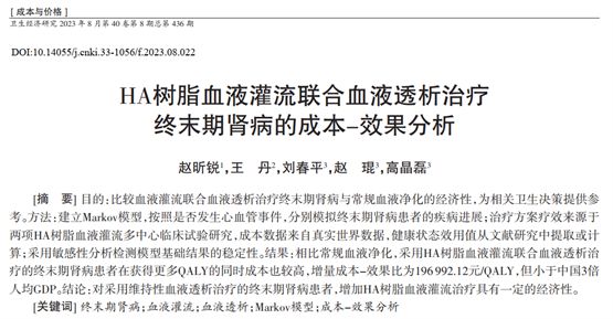8月1日,國(guó)家衛(wèi)生健康委衛(wèi)生發(fā)展研究中心、國(guó)家藥物與衛(wèi)生技術(shù)綜合評(píng)估中心趙琨研究員等的研究成果《HA樹脂血液灌流聯(lián)合血液透析治療終末期腎病的成本-效果分析》發(fā)表于《衛(wèi)生經(jīng)濟(jì)研究》雜志。
