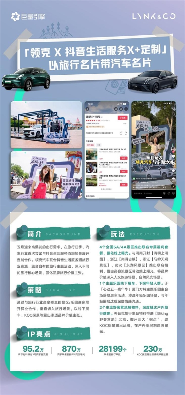 針對領(lǐng)克汽車亟需打響“旅游出行必選車”的需求,抖音生活服務酒旅商家首次與汽車客戶領(lǐng)克進行聯(lián)動,將領(lǐng)克汽車帶進全國景區(qū)、主題樂園、營地等旅行場景,推動“汽車+旅游”新融合,宣揚“領(lǐng)克汽車=旅行新選擇”品牌價值主張。