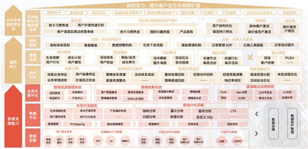 上圖為數(shù)字化經(jīng)營(yíng)能力全景圖,最上層為全生命周期經(jīng)營(yíng)規(guī)劃,即 AUM&MAU 雙軌經(jīng)營(yíng)體系,包括不同階段的主要運(yùn)營(yíng)目標(biāo),如新手期主要為用卡習(xí)慣養(yǎng)成、用戶價(jià)值快速識(shí)別、新戶首面后離店經(jīng)營(yíng)繼承等。
