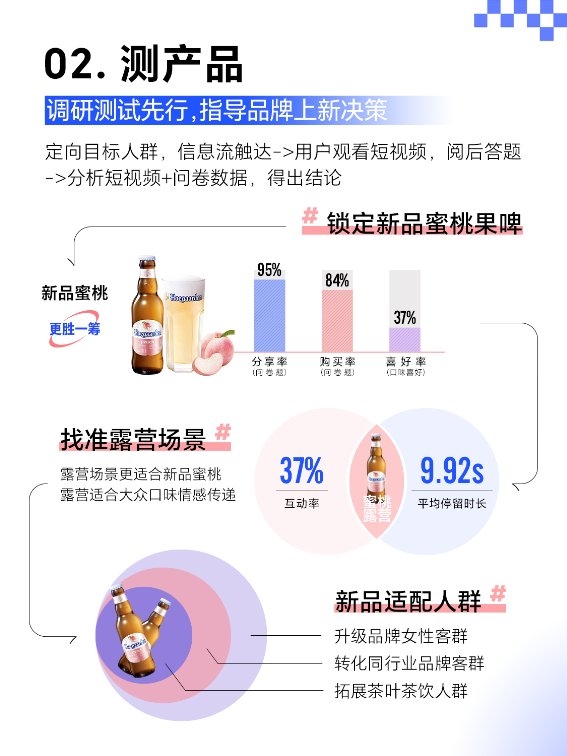 為了更快、更準(zhǔn)地抓住抖音市場(chǎng)機(jī)會(huì),福佳在新品實(shí)驗(yàn)室指導(dǎo)下,詳細(xì)制定2個(gè)新品×9個(gè)人群×4套素材的測(cè)試方案。針對(duì)目標(biāo)客群、內(nèi)容、商品,通過信息流快速觸達(dá)進(jìn)行測(cè)試,得出新品潛力、人群價(jià)值及受訪者偏好的內(nèi)容場(chǎng)景,發(fā)現(xiàn)蜜桃口味更受消費(fèi)者偏愛,適合在露營(yíng)場(chǎng)景進(jìn)行傳播。福佳基于此進(jìn)行貨品布局,確定整體策略的優(yōu)化方向。