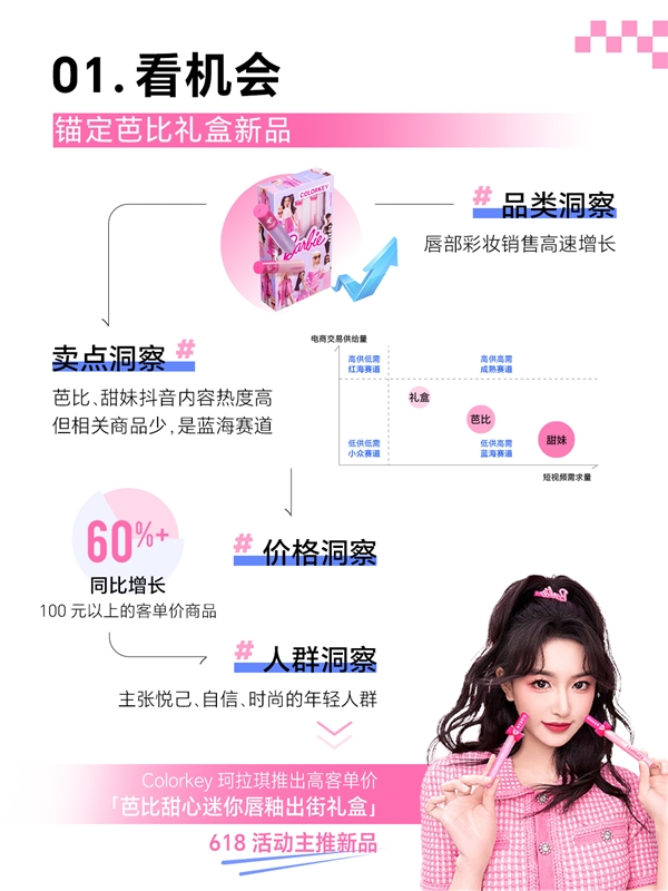 適用于送禮、提升品牌調(diào)性、具有高客單價(jià)特征的“芭比禮盒”新品,符合品牌風(fēng)格特點(diǎn)和消費(fèi)需求,適宜作為品牌形象款進(jìn)行主推和破圈?;诖?珂拉琪打造高客單價(jià)“芭比甜心迷你唇釉出街禮盒”作為618活動(dòng)的主推新品,強(qiáng)力吸引目標(biāo)人群。