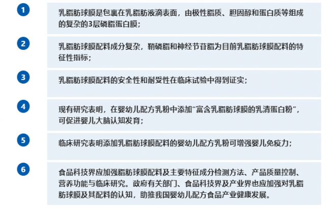 專家組參考自1965年至2022年期間的相關文獻,通過專題討論形式,達成了6項共識性觀點和建議,其中包括乳脂肪球膜配料的安全性和耐受性在臨床試驗中得到證實;現(xiàn)有研究表明添加乳脂肪球膜配料及磷脂的嬰幼兒配方乳粉可促進嬰兒大腦認知發(fā)育;臨床研究表明添加乳脂肪球膜配料的嬰幼兒配方乳粉可增強嬰兒免疫力;食品科技界應加強乳脂肪球膜配料及主要特征成分檢測方法、產品質量控制、營養(yǎng)功能與臨床研究。政府部門、食品科技界及產業(yè)界也應加強對乳脂肪球膜及其配料的認知,助推我國嬰幼兒配方食品產業(yè)健康發(fā)展等。