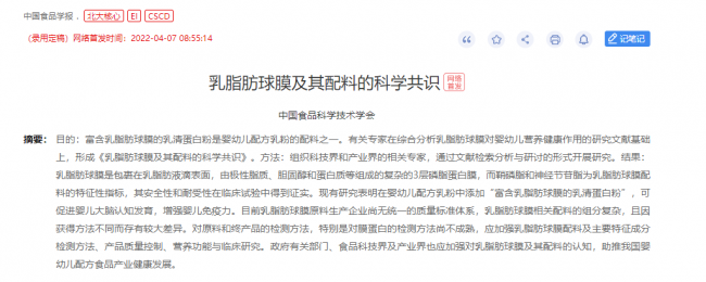 4月7日,《中國食品學報》刊發(fā)中國食品學界剛剛取得的一個突破性科學共識成果——中國工程院院士、中國農業(yè)大學營養(yǎng)與健康研究院院長任發(fā)政等近20位中國食品科學技術學會權威專家形成了國內首個《乳脂肪球膜及其配料的科學共識》(以下簡稱“乳脂肪球膜科學共識”),共識明確指出,嬰幼兒配方乳粉添加“富含乳脂肪球膜的乳清蛋白粉”后可促進嬰兒大腦認知發(fā)育、增強嬰兒免疫力。