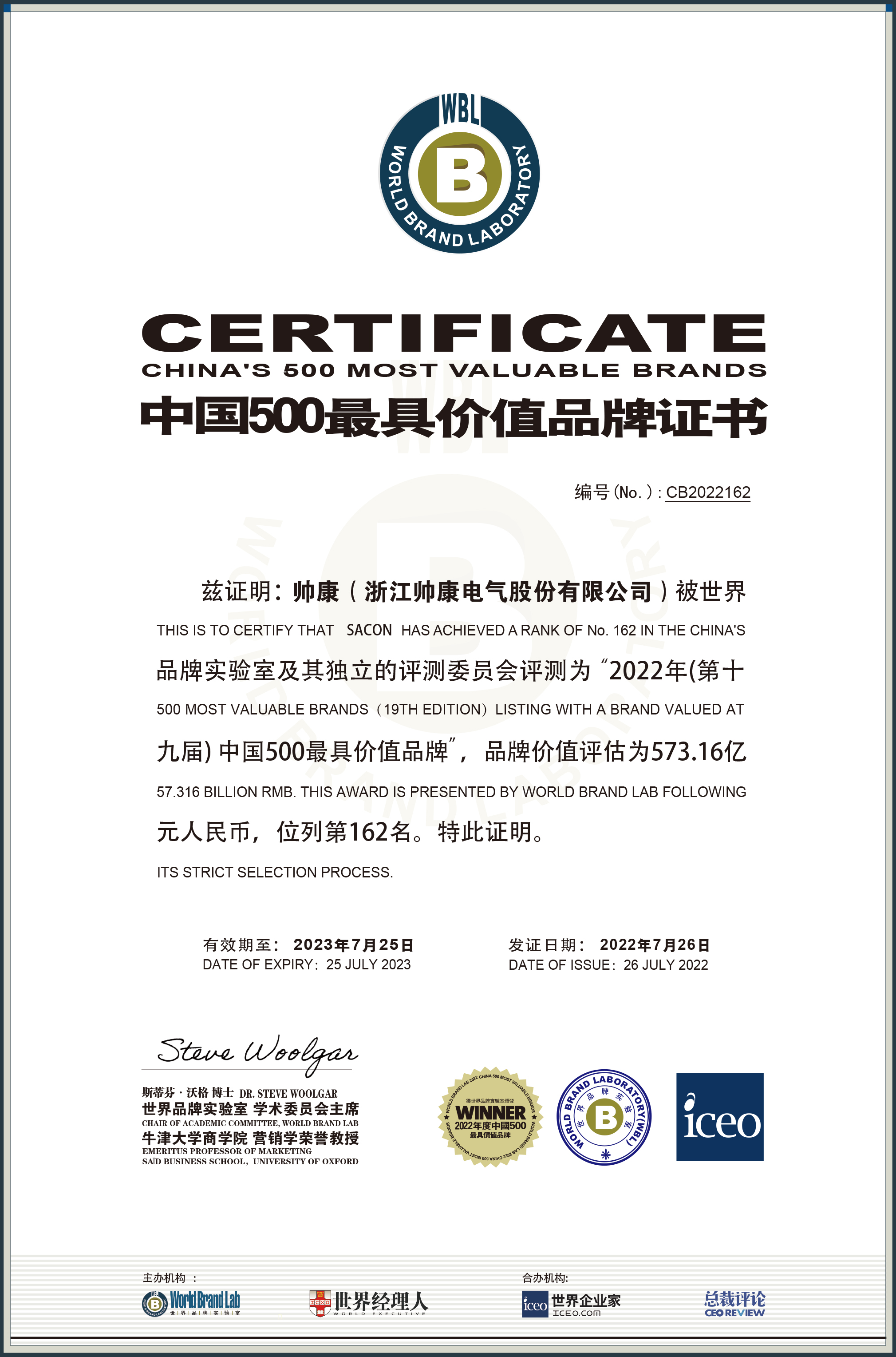 2022年7月26日,由世界品牌實驗室(World Brand Lab)主辦的第十九屆世界品牌大會在北京舉行,會上發(fā)布了2022年《中國500最具價值品牌》分析報告。作為健康廚房開創(chuàng)者,帥康以573.16億元的品牌價值連續(xù)15年強勢入選榜單,在專業(yè)廚電品牌中位列第一,品牌領(lǐng)跑地位得到行業(yè)內(nèi)外的廣泛認(rèn)可。
