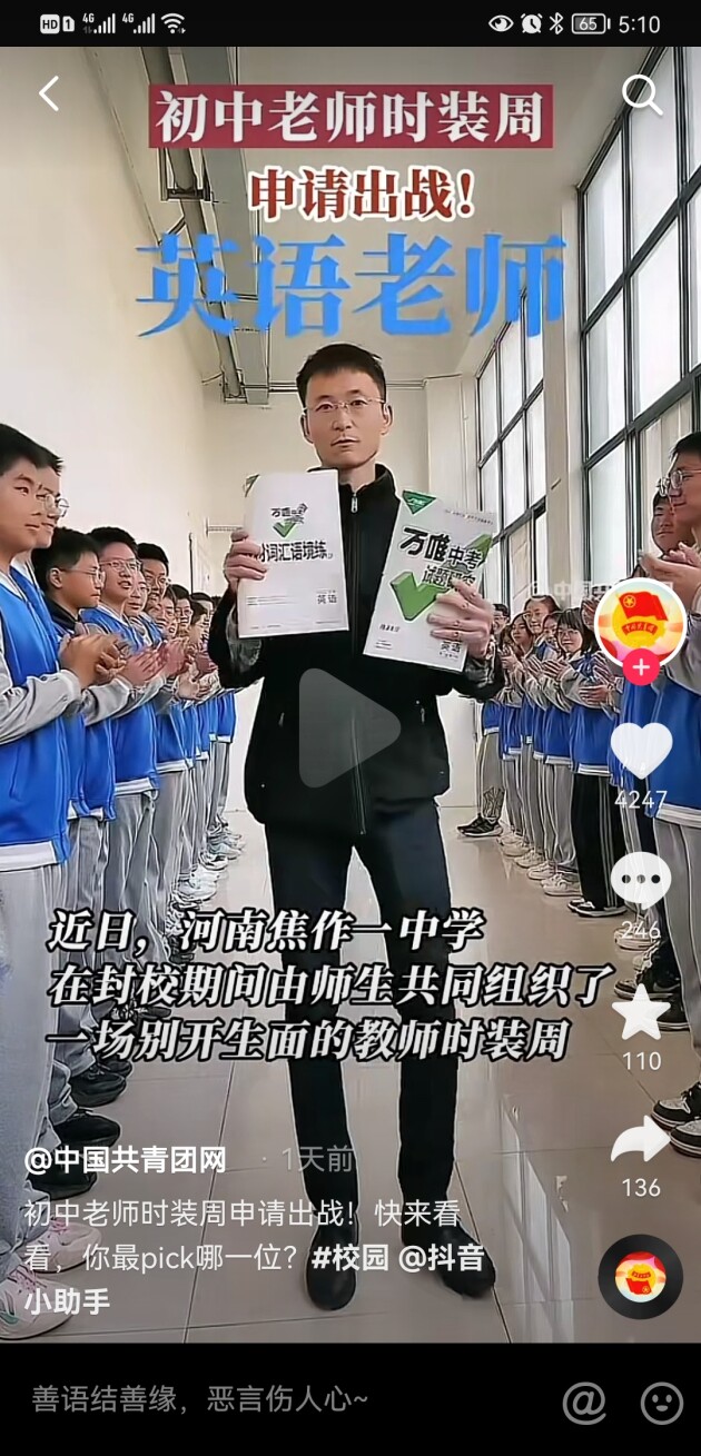 記者還注意到,“老師時裝秀”的相關視頻覆蓋面非常廣泛,在吉林、河北、河南、陜西、安徽、云南等多地校園均有出現(xiàn),其中一段河南焦作的“走秀”短視頻更是得到了中國共青團網(wǎng)抖音賬號的轉發(fā)。據(jù)悉,該視頻來源于焦作的一所初中,語文、數(shù)學、英語、物理等各科老師幾乎都參與了“走秀”,學生們在一旁喝彩鼓掌,每個人臉上都洋溢著歡樂的笑容。