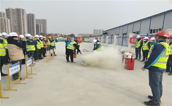 最后,在現(xiàn)場(chǎng)開(kāi)展模擬火災(zāi)救援演練,項(xiàng)目管理人員與施工作業(yè)人員進(jìn)行現(xiàn)場(chǎng)滅火實(shí)操演練。