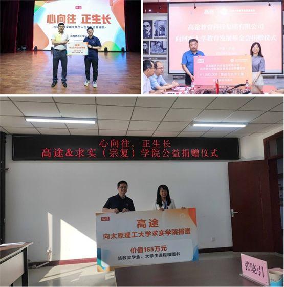 為幫助引導(dǎo)當(dāng)代大學(xué)生樹立正確的學(xué)習(xí)觀和就業(yè)觀,增強(qiáng)職業(yè)生涯規(guī)劃意識,培養(yǎng)創(chuàng)新創(chuàng)業(yè)思維,保持奮發(fā)昂揚(yáng)向上的精神狀態(tài)。6月12日到15日,高途先后向山西師范大學(xué)、太原理工大學(xué)、河南大學(xué)、武漢理工大學(xué)四所大學(xué)捐贈了總價值超過600萬元的課程書和書籍,支持在校大學(xué)生學(xué)習(xí)提升。同時高途在山西師范大學(xué)、太原理工大學(xué)設(shè)立了連續(xù)三年的“獎教獎學(xué)金”,用于獎勵有突出貢獻(xiàn)的教學(xué)項(xiàng)目和表現(xiàn)優(yōu)異的在校大學(xué)生。